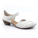 Pantofi dama de vara Rieker, din piele, de culoare alba. Au toc mic si lat si sunt decorati cu perforatii in fata. Inchidere cu catarama.