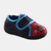 Papuci de casa copii, de culoarea albastra, din material textil. Modelul este decorat cu o masinuta, iar pentru o fixare mai buna a piciorului, este prevazut cu scai.