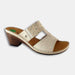 Papuci cu toc Reflexan pentru femei, de culoare bej, cu o bareta lata, din elastic, decorata si cu cusatura de decor in jurul talpii, conforabili, datorita tocului mic si lat, dotat cu sistem antishock.