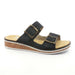 Papuci dama Rieker, din piele nubuck, de culoare albastra. Au talpa groasa de 3 cm la baza calcaiului, Antistress, adica moale si flexibil, special in zona de indoire a talpii. Sunt dotati cu catarame pe partea superioara pentru o reglare ideala dupa latimea piciorului.