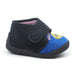 Papuci de casa copii, de culoarea albastra, din material textil. Modelul este decorat in fata, iar pentru o fixare mai buna a piciorului, este prevazut cu scai.
