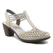 Saboti dama marca Rieker, din piele, de culoare bej, decorat cu perforatii. Au toc mic de 3,5 cm, lat si sunt prevazuti cu elastic pentru o incaltare mai usoara.